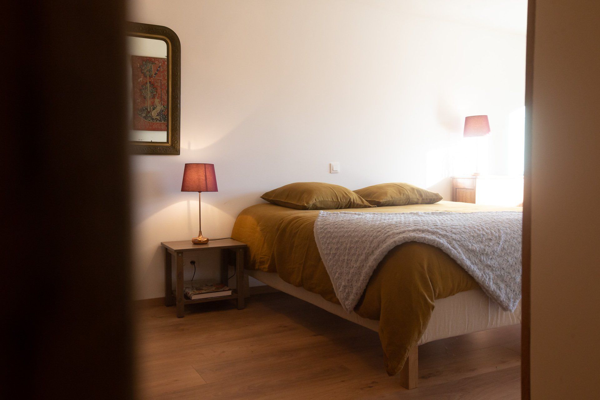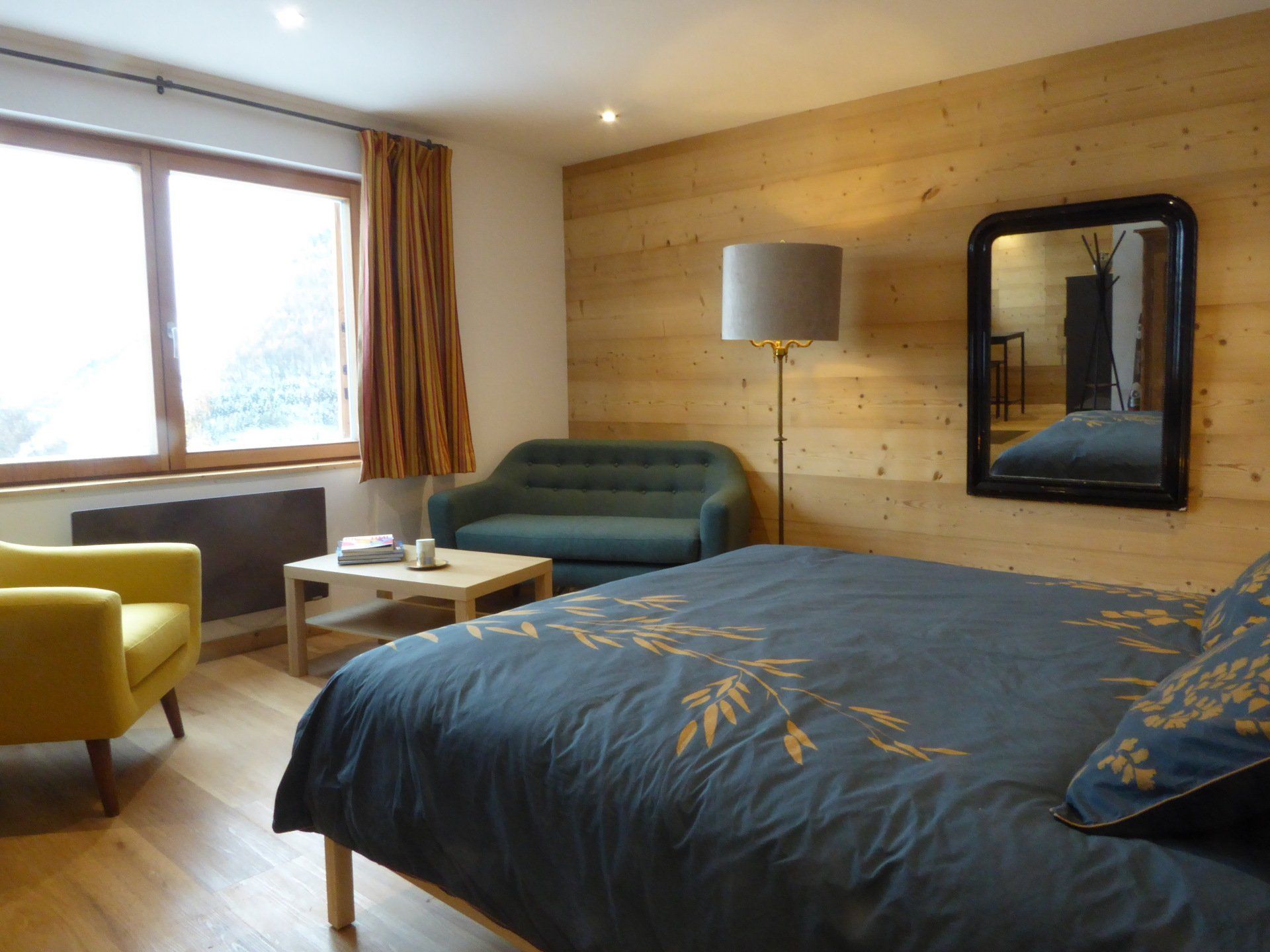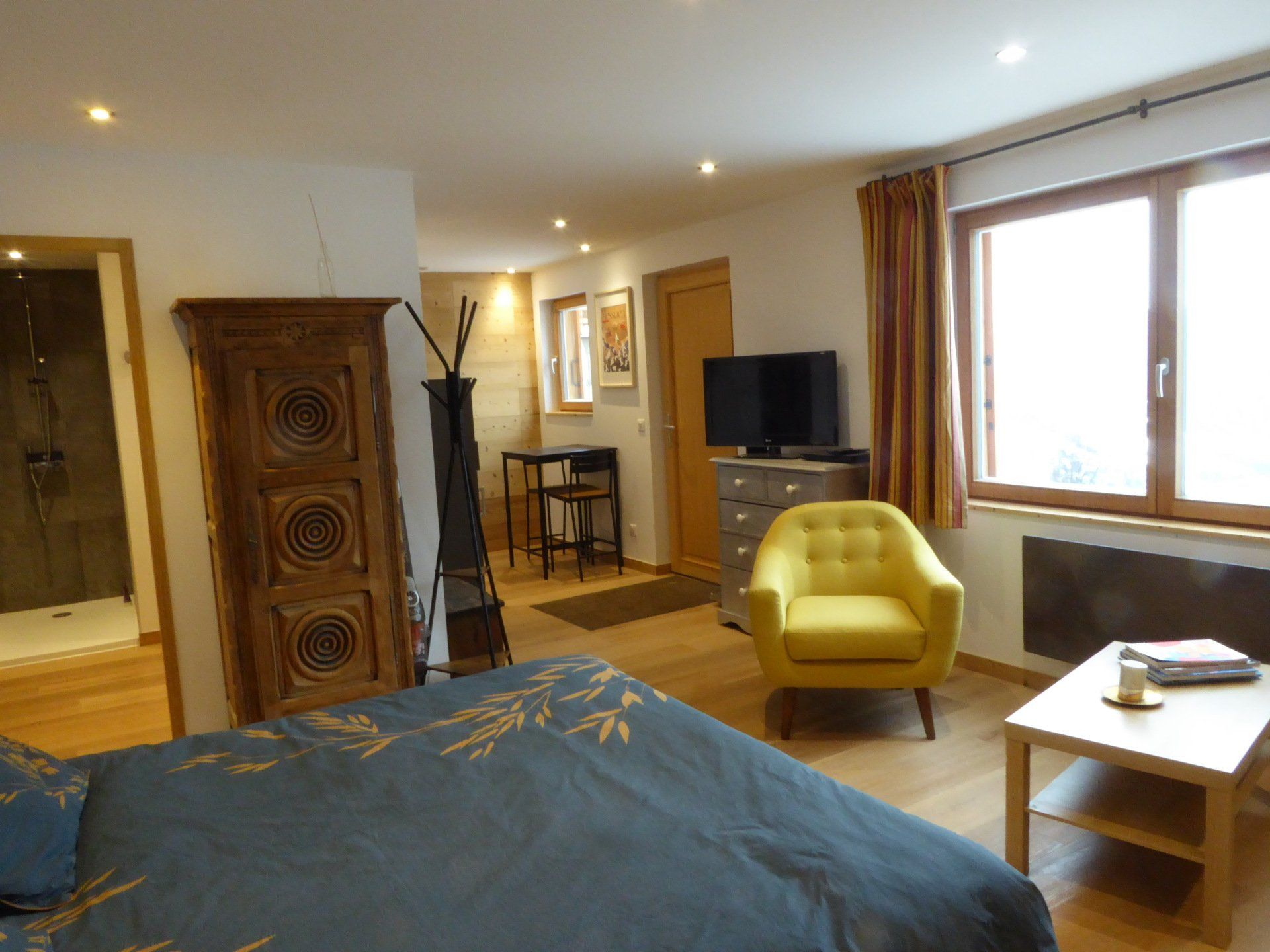 Lit double en 160, coin salon, salle de bain et toilettes, terrasse Sud commune aux 2 chambres.
